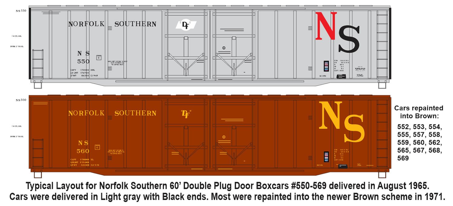 F-515 – Norfolk Southern (Original) Thrall 60′ Double Plug Door Boxcars #550-569 as Delivered & Repaints